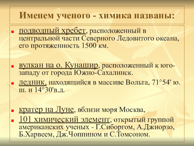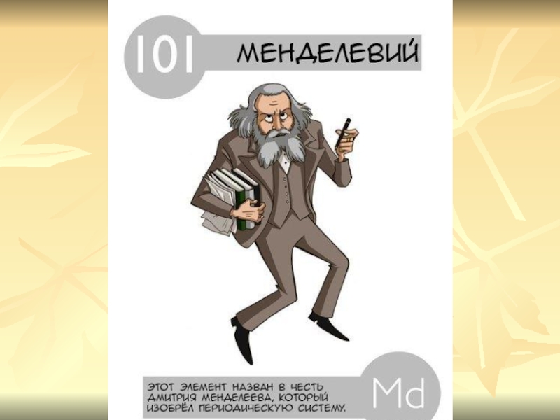 101 химический элемент, открытый группой американских ученых - Г.Сиборгом, А.Джиорзо, Б.Харвеем, Дж.Чоппином и С.Томсоном.