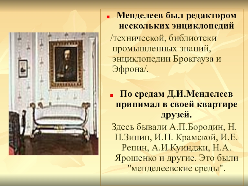 По средам Д.И.Менделеев принимал в своей квартире друзей.