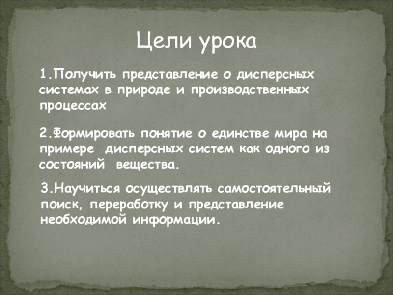 2.Формировать понятие о единстве мира на примере дисперсных систем как одного из состояний вещества.