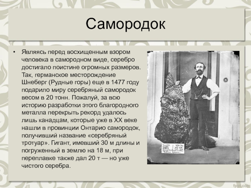 огромных размеров. Так, германское месторождение Шнеберг (Рудные горы) еще в 1477 году подарило миру серебряный самородок весом в 20 тонн. Пожалуй, за всю историю разработки этого благородного металла перекрыть рекорд удалось лишь канадцам, которые уже в ХХ веке нашли в провинции Онтарио самородок, получивший название «серебряный тротуар». Гигант, имевший 30 м длины и погруженный в землю на 18 м, при переплавке также дал 20 т — но уже чистого серебра.