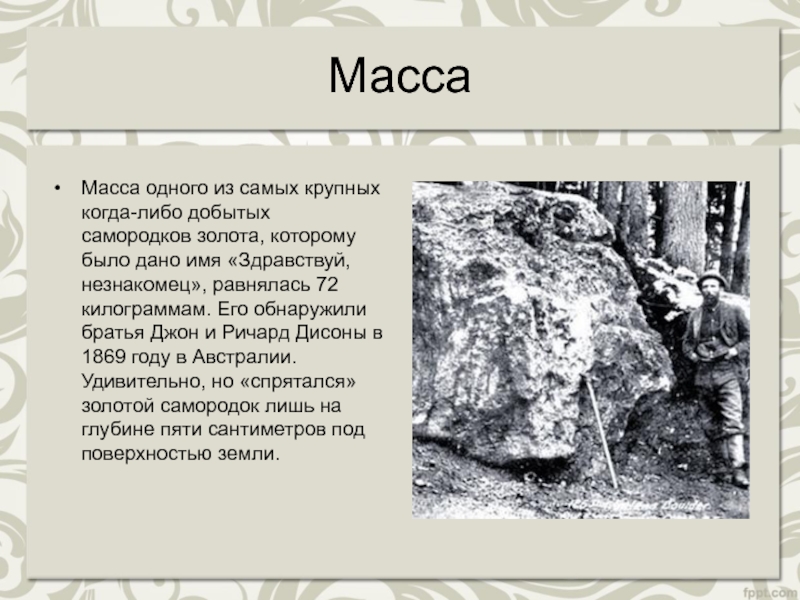 дано имя «Здравствуй, незнакомец», равнялась 72 килограммам. Его обнаружили братья Джон и Ричард Дисоны в 1869 году в Австралии. Удивительно, но «спрятался» золотой самородок лишь на глубине пяти сантиметров под поверхностью земли.