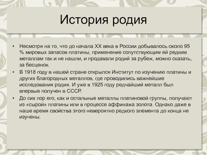 В 1918 году в нашей стране открылся Институт по изучению платины и других благородных металлов, где проводились важнейшие исследования родия. И уже в 1925 году редчайший металл был впервые получен в СССР.