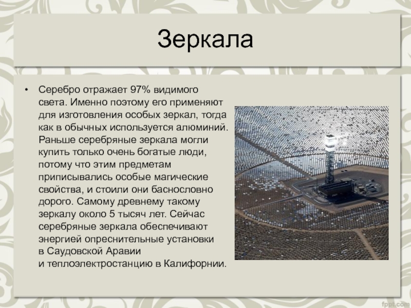 зеркал, тогда как в обычных используется алюминий. Раньше серебряные зеркала могли купить только очень богатые люди, потому что этим предметам приписывались особые магические свойства, и стоили они баснословно дорого. Самому древнему такому зеркалу около 5 тысяч лет. Сейчас серебряные зеркала обеспечивают энергией опреснительные установки в Саудовской Аравии и теплоэлектростанцию в Калифорнии.