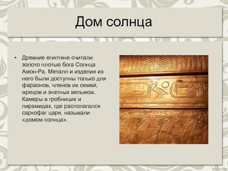 изделия из него были доступны только для фараонов, членов их семей, жрецов и знатных вельмож. Камеры в гробницих и пирамидах, где располагался саркофаг царя, называли «домом солнца».
