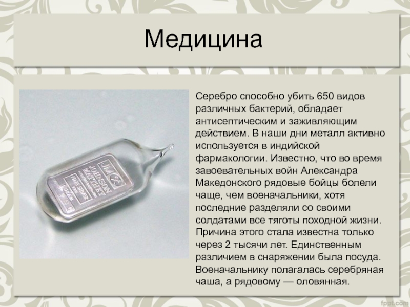 Серебро способно убить 650 видов различных бактерий, обладает антисептическим и заживляющим действием.