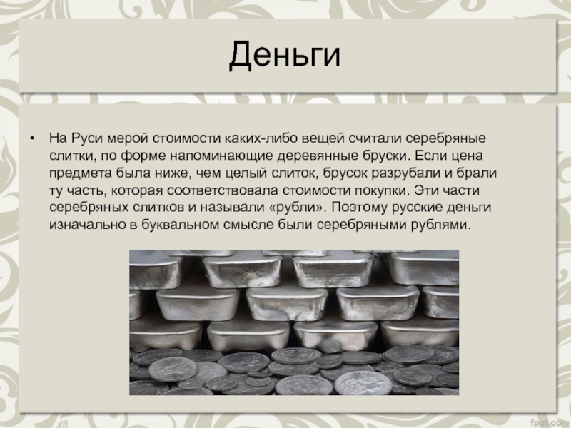 бруски. Если цена предмета была ниже, чем целый слиток, брусок разрубали и брали ту часть, которая соответствовала стоимости покупки. Эти части серебряных слитков и называли «рубли». Поэтому русские деньги изначально в буквальном смысле были серебряными рублями.