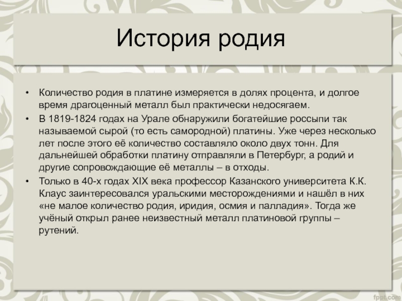 Только в 40-х годах XIX века профессор Казанского университета К.К. Клаус заинтересовался уральскими месторождениями и нашёл в них «не малое количество родия, иридия, осмия и палладия». Тогда же учёный открыл ранее неизвестный металл платиновой группы – рутений.