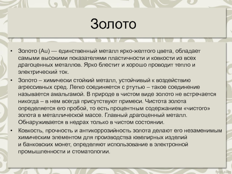 Золото – химически стойкий металл, устойчивый к воздействию агрессивных сред. Легко соединяется с ртутью – такое соединение называется амальгамой. В природе в чистом виде золото не встречается никогда – в нем всегда присутствуют примеси. Чистота золота определяется его пробой, то есть процентным содержанием «чистого» золота в металлической массе. Главный драгоценный металл. Обнаруживается в недрах только в чистом состоянии.