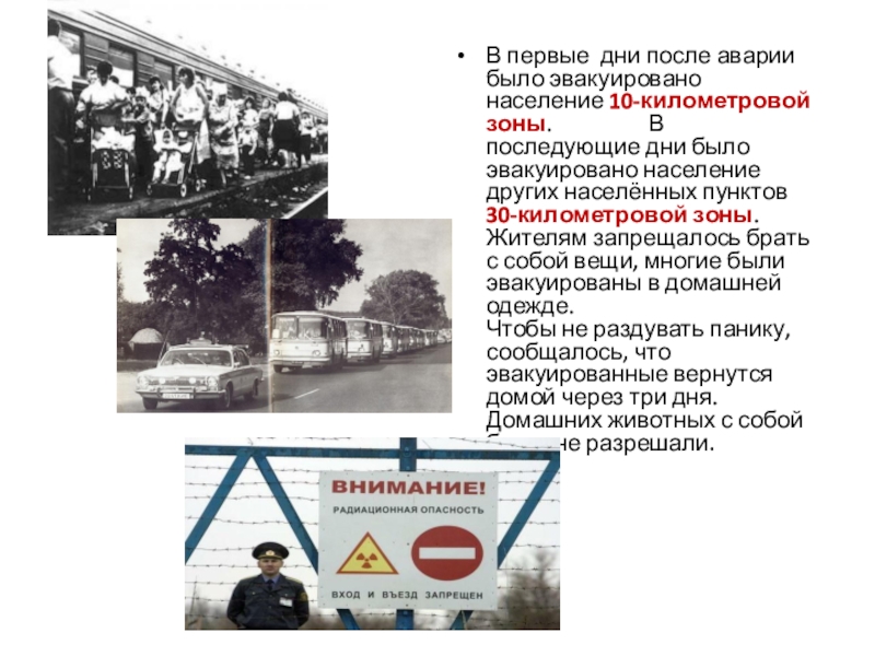 Слайд 12В первые дни после аварии было эвакуировано население 10-километровой зоны.
