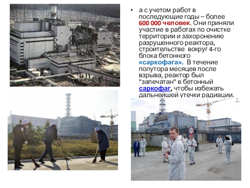 600 000 человек. Они приняли участие в работах по очистке территории и захоронению разрушенного реактора, строительстве вокруг 4-го блока бетонного «саркофага». В течение полутора месяцев после взрыва, реактор был "запечатан" в бетонный саркофаг, чтобы избежать дальнейшей утечки радиации.