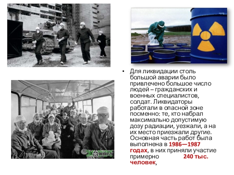гражданских и военных специалистов, солдат. Ликвидаторы работали в опасной зоне посменно: те, кто набрал максимально допустимую дозу радиации, уезжали, а на их место приезжали другие. Основная часть работ была выполнена в 1986—1987 годах, в них приняли участие примерно 240 тыс. человек,