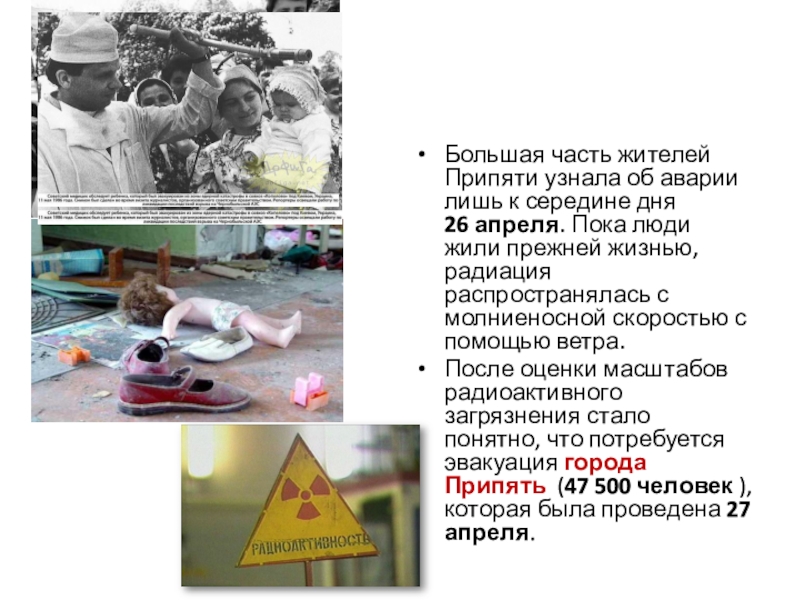 Слайд 11Большая часть жителей Припяти узнала об аварии лишь к середине дня