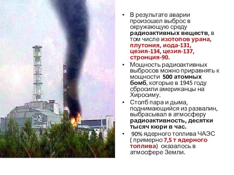 Слайд 5В результате аварии произошел выброс в окружающую среду радиоактивных веществ, в