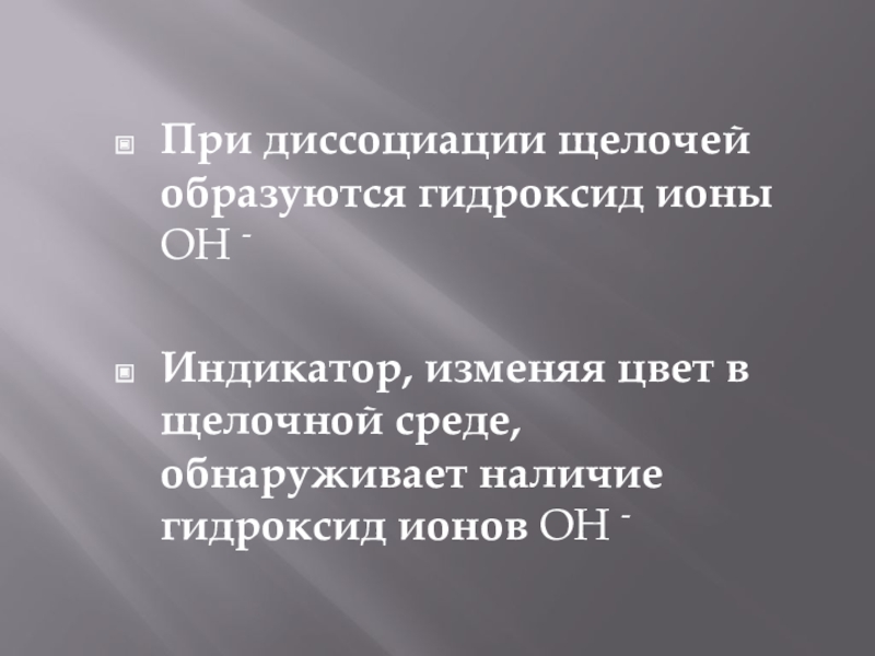 При диссоциации щелочей образуются гидроксид ионы OH -Индикатор, изменяя цвет в щелочной среде, обнаруживает наличие гидроксид ионов