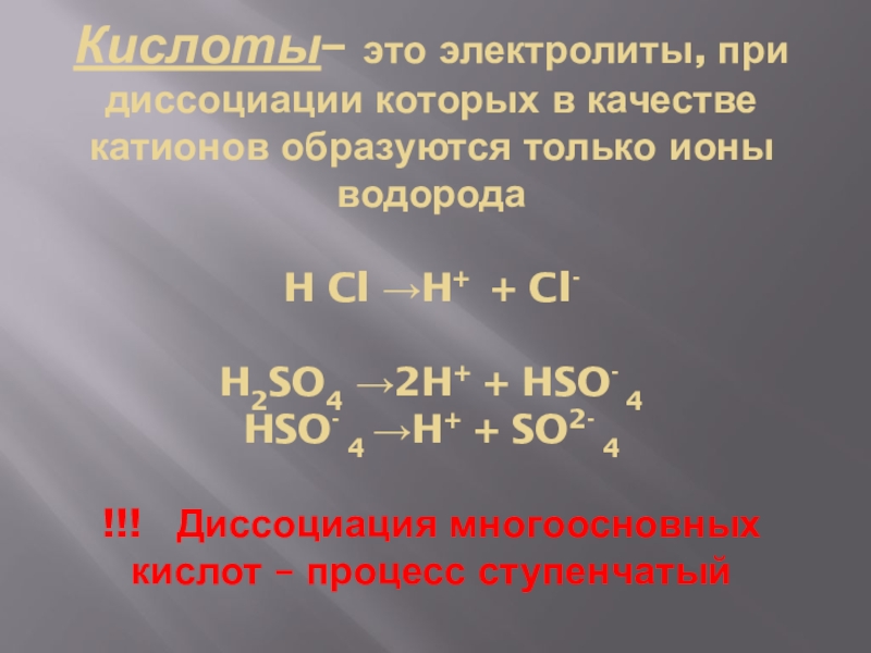 ионы водорода H Cl →H+ + Cl- H2SO4 →2H+ + HSO- 4 HSO- 4 →H+ + SO2- 4 !!! Диссоциация многоосновных кислот – процесс ступенчатый