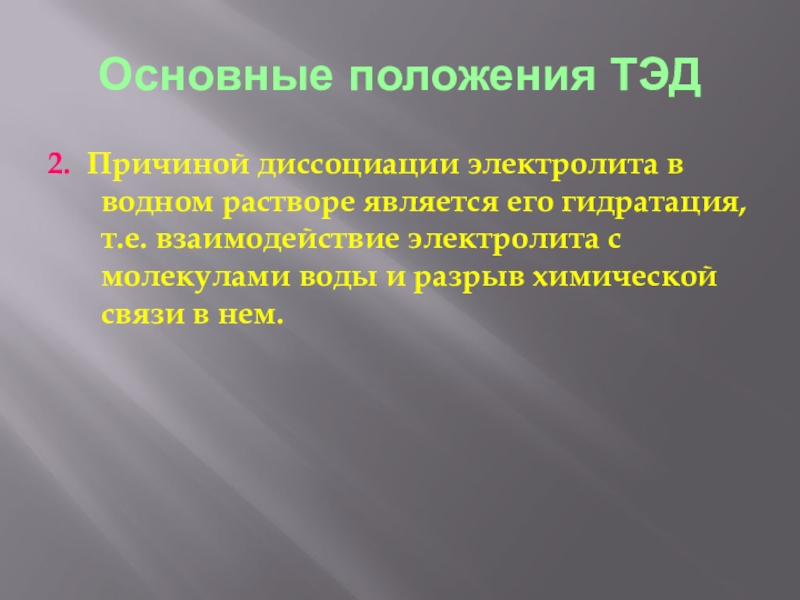 Основные положения ТЭД2. Причиной диссоциации электролита в водном растворе является его гидратация, т.е. взаимодействие электролита с молекулами