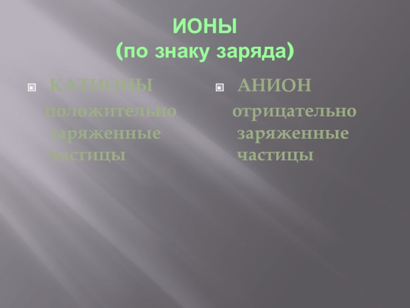 ИОНЫ (по знаку заряда)КАТИОНЫ  положительно заряженные частицыАНИОН  отрицательно заряженные частицы