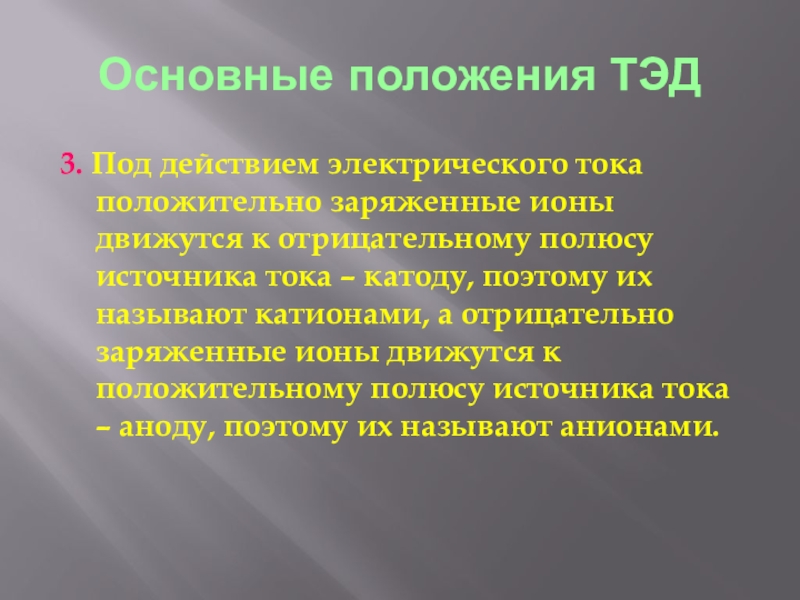 Основные положения ТЭД3. Под действием электрического тока  положительно заряженные ионы движутся к отрицательному полюсу источника тока