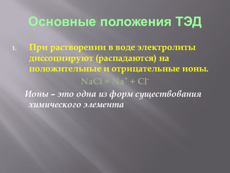 Основные положения ТЭДПри растворении в воде электролиты диссоциируют (распадаются) на положительные и отрицательные ионы.NaCl = Na+ +