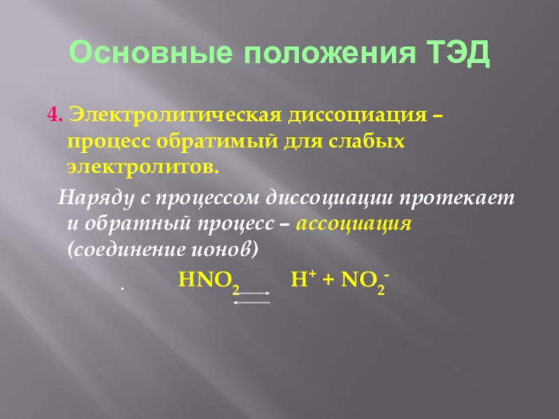 Основные положения ТЭД 4. Электролитическая диссоциация – процесс обратимый для слабых электролитов.  Наряду с процессом диссоциации