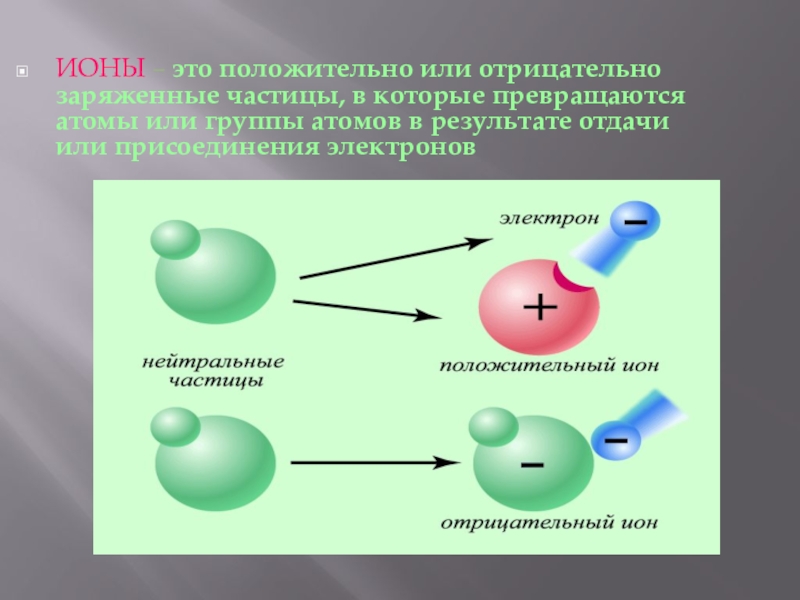 Слайд 5ИОНЫ – это положительно или отрицательно заряженные частицы, в которые превращаются