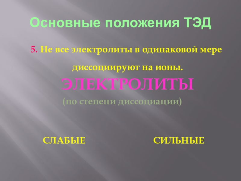 Основные положения ТЭД  5. Не все электролиты в одинаковой мере диссоциируют на ионы. ЭЛЕКТРОЛИТЫ(по степени диссоциации)