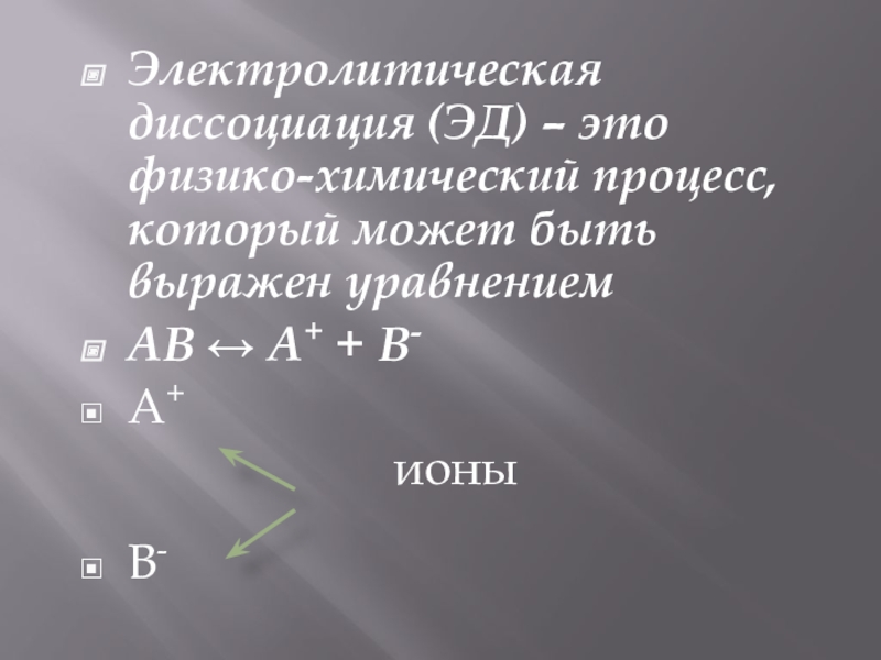 Электролитическая диссоциация (ЭД) – это физико-химический процесс, который может быть выражен уравнением AB ↔ A+ + B-A+ ионыB-