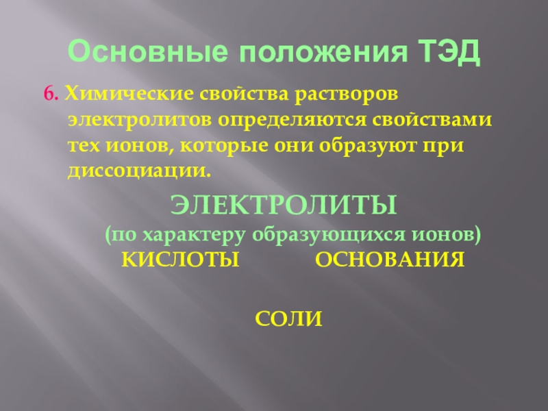 Основные положения ТЭД6. Химические свойства растворов электролитов определяются свойствами тех ионов, которые они образуют при диссоциации. ЭЛЕКТРОЛИТЫ
