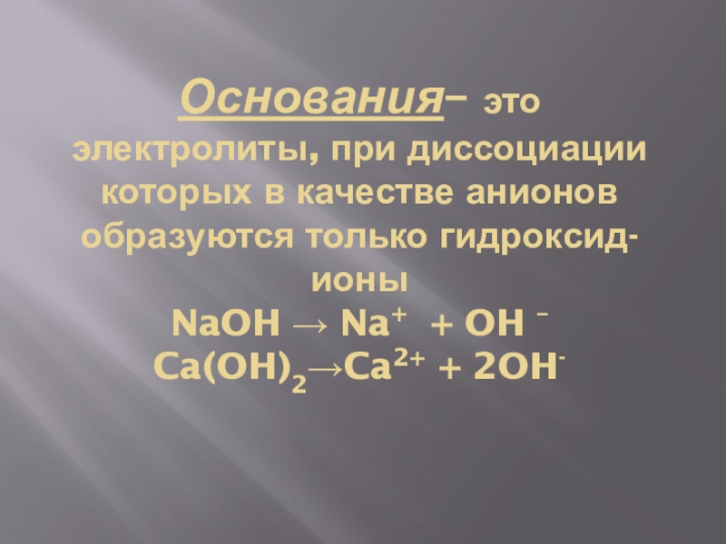 Основания– это электролиты, при диссоциации которых в качестве анионов образуются только гидроксид-ионы NaOH → Na+  +