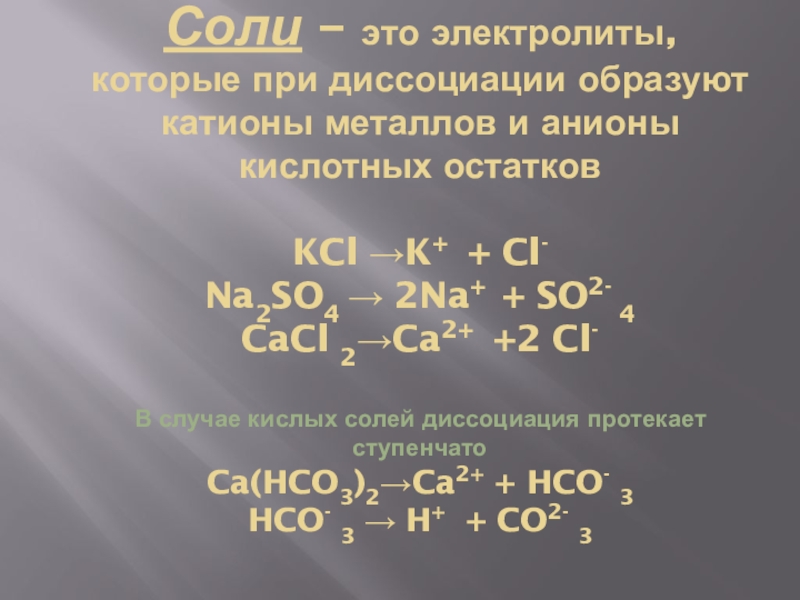 анионы кислотных остатков KCl →K+ + Cl- Na2SO4 → 2Na+ + SO2- 4 CaCl 2→Ca2+ +2 Cl- В случае кислых солей диссоциация протекает ступенчато Ca(HCO3)2→Ca2+ + HCO- 3 HCO- 3 → H+ + CO2- 3