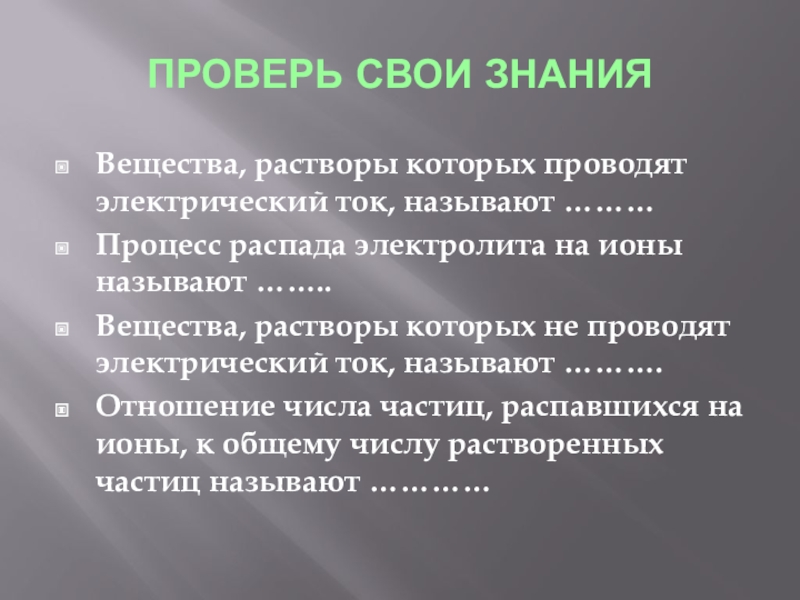 ПРОВЕРЬ СВОИ ЗНАНИЯВещества, растворы которых проводят электрический ток, называют ………Процесс распада электролита на ионы называют ……..Вещества, растворы