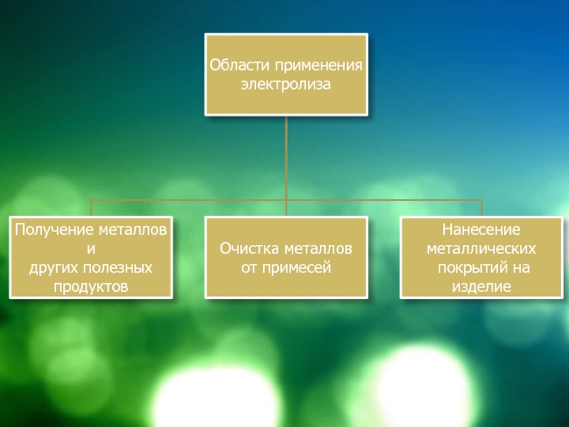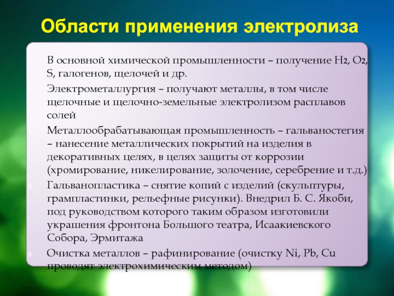 Области применения электролиза В основной химической промышленности – получение H2, O2, S, галогенов, щелочей и др.Электрометаллургия – получают металлы, в том числе щелочные и щелочно-земельные электролизом расплавов солейМеталлообрабатывающая промышленность – гальваностегия – нанесение металлических