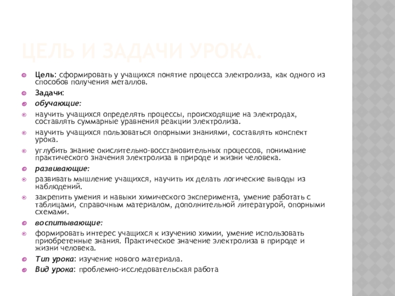 Цель: сформировать у учащихся понятие процесса электролиза, как