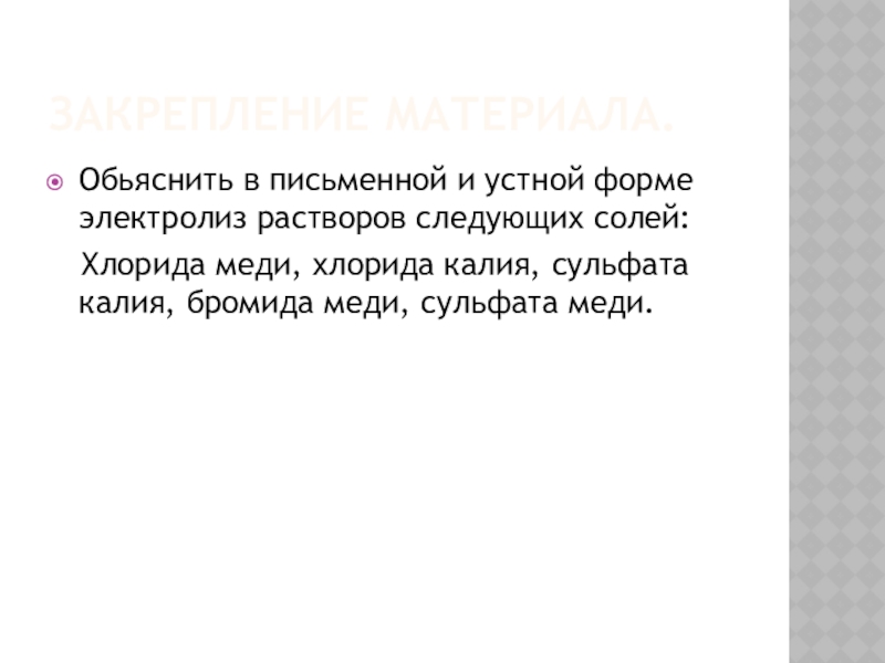 научить учащихся определять процессы, происходящие на электродах, составлять суммарные уравнения реакции электролиза.
