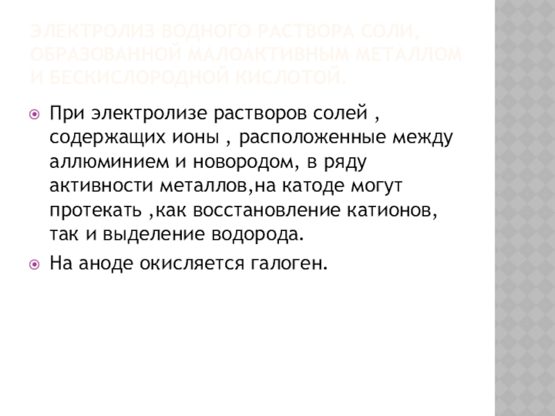 Слайд 10Электролиз водного раствора соли, образованной активным металлом и бескислородной кислотой.