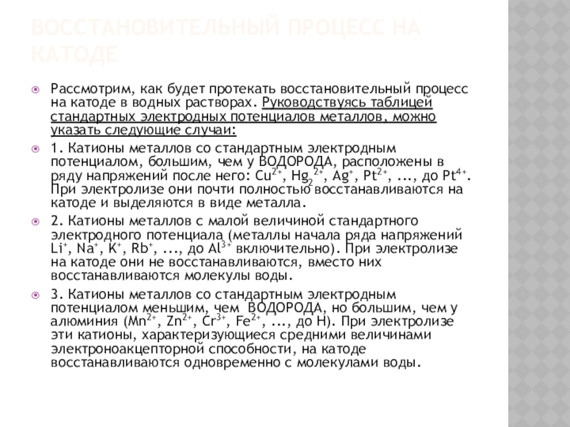 1. Катионы металлов со стандартным электродным потенциалом, большим, чем у ВОДОРОДА, расположены в ряду напряжений после него: Cu2+, Hg22+, Ag+, Pt2+, ..., до Pt4+. При электролизе они почти полностью восстанавливаются на катоде и выделяются в виде металла.