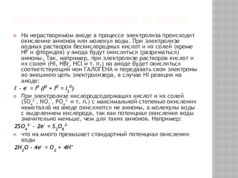 анионов или молекул воды. При электролизе водных растворов бескислородных кислот и их солей (кроме HF и фторидов) у анода будут окисляться (разряжаться) анионы. Так, например, при электролизе растворов кислот и их солей (HI, HBr, HCl и т. п.) на аноде будет окисляться соответствующий ион ГАЛОГЕНА и передавать свои электроны во внешнюю цепь электролизера, в случае HI реакция на аноде: