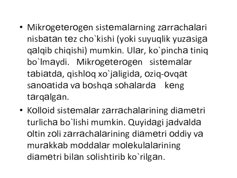 Слайд 5Mikrоgеtеrоgеn sistеmаlаrning zаrrаchаlаri nisbаtаn tеz cho`kishi (yoki suyuqlik yuzаsigа qаlqib chiqishi)
