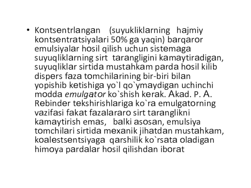 bo`lsа, o`tа kоntsеntrlаngаn emulsiyagа egа bo`lаmiz.