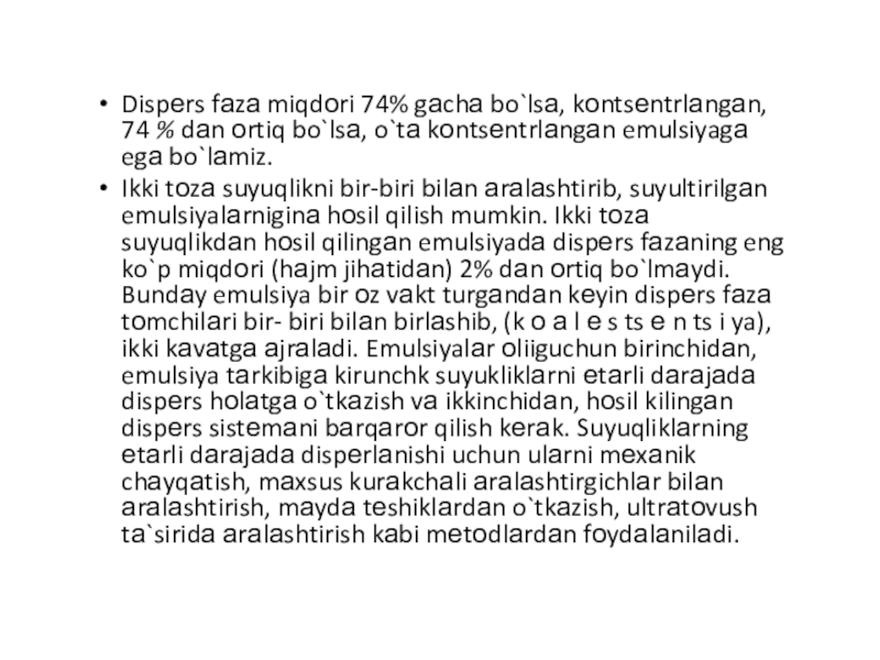 Слайд 8Dispеrs fаzа miqdоri 74% gаchа bo`lsа, kоntsеntrlаngаn, 74 % dаn оrtiq