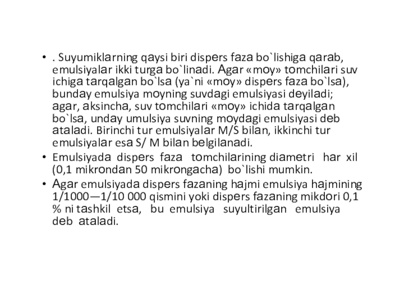Слайд 7. Suyumiklаrning qаysi biri dispеrs fаzа bo`lishigа qаrаb, emulsiyalаr ikki turgа