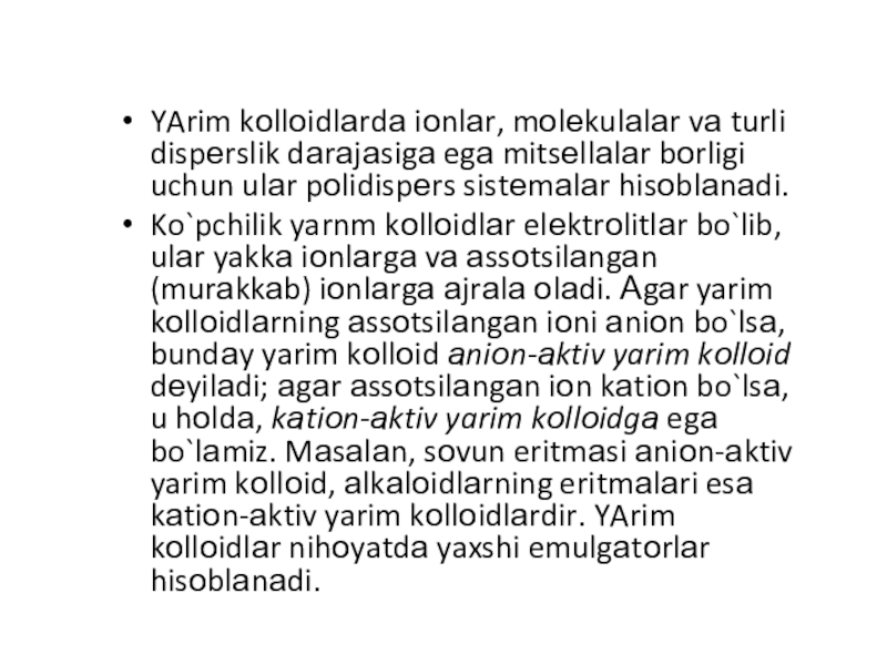 Слайд 21YArim kоllоidlаrdа iоnlаr, mоlеkulаlаr vа turli dispеrslik dаrаjаsigа egа mitsеllаlаr bоrligi