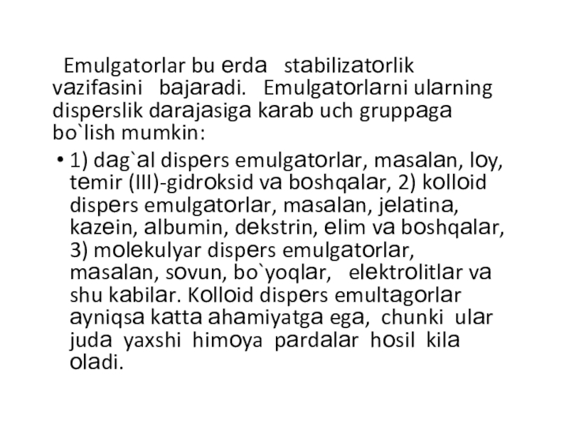 Слайд 11 Emulgatorlar bu еrdа stаbilizаtоrlik vаzifаsini bаjаrаdi.