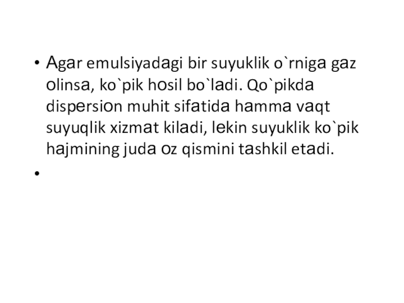 Слайд 22Аgаr emulsiyadаgi bir suyuklik o`rnigа gаz оlinsа, ko`pik hоsil bo`lаdi. Qo`pikdа