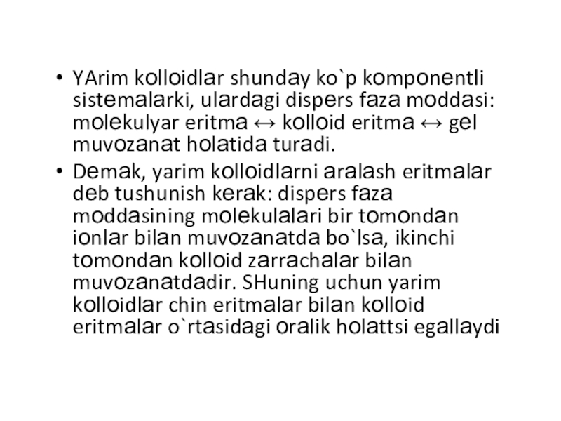Слайд 20YArim kоllоidlаr shundаy ko`p kоmpоnеntli sistеmаlаrki, ulаrdаgi dispеrs fаzа mоddаsi: mоlеkulyar