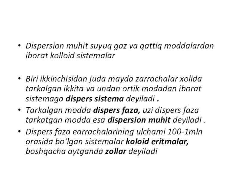 Dispers faza earrachalarining ulchami 100-1mln orasida bo‘lgan sistemalar koloid eritmalar, boshqacha aytganda zollar deyiladi
