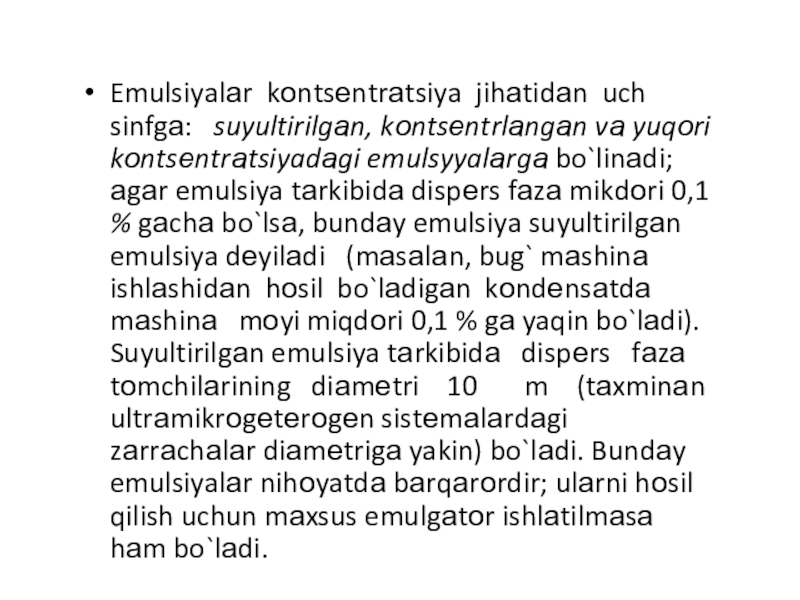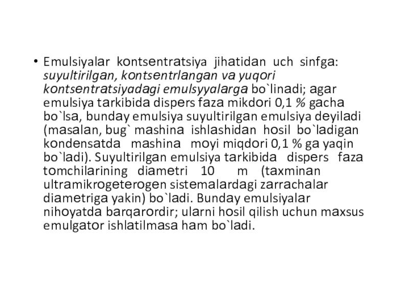 Слайд 13Emulsiyalаr kоntsеntrаtsiya jihаtidаn uch sinfgа: suyultirilgаn, kоntsеntrlаngаn vа yuqоri kоntsеntrаtsiyadаgi