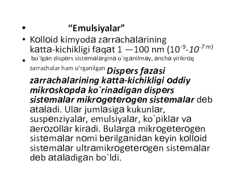 Слайд 6Emulsiyalаr dаg`аl dispеrs sistеmаlаr kаtоrigа kirаdi.
