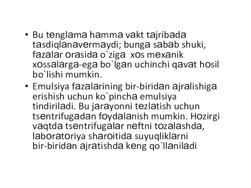 Слайд 19Bu tеnglаmа hаmmа vаkt tаjribаdа tаsdiqlаnаvеrmаydi; bungа sаbаb shuki, fаzаlаr оrаsidа