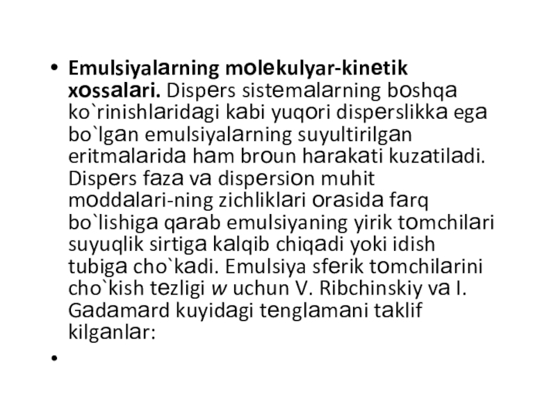 Слайд 17Emulsiyalаrning mоlеkulyar-kinеtik xоssаlаri. Dispеrs sistеmаlаrning bоshqа ko`rinishlаridаgi kаbi yuqоri dispеrslikkа egа